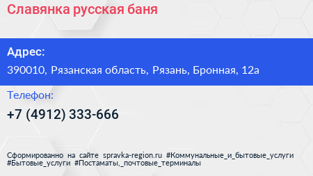 Славянка, русская баня по адресу 390010, Рязанская область, Рязань, Бронная, 12а в дальнейшем Организация, размещена в следующих категориях: