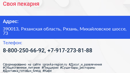 Своя пекарня по адресу 390013, Рязанская область, Рязань, Михайловское шоссе, 73 в дальнейшем Организация, размещена в следующих категориях: