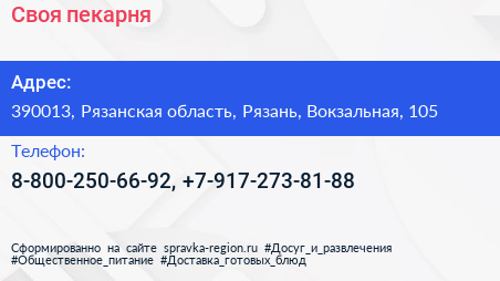 Своя пекарня по адресу 390013, Рязанская область, Рязань, Вокзальная, 105 в дальнейшем Организация, размещена в следующих категориях: