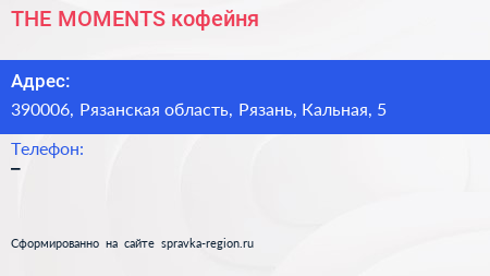 THE MOMENTS, кофейня по адресу 390006, Рязанская область, Рязань, Кальная, 5 в дальнейшем Организация, размещена в следующих категориях: