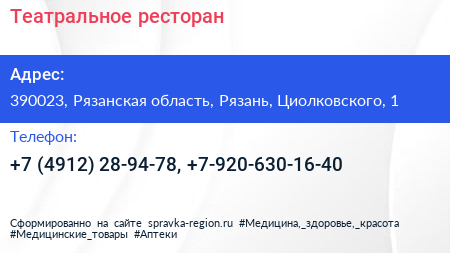 Театральное, ресторан по адресу 390023, Рязанская область, Рязань, Циолковского, 1 в дальнейшем Организация, размещена в следующих категориях: