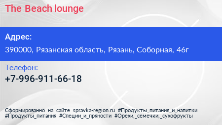 The Beach lounge по адресу 390000, Рязанская область, Рязань, Соборная, 46г в дальнейшем Организация, размещена в следующих категориях: