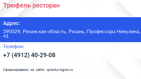 Трюфель, ресторан по адресу 390029, Рязанская область, Рязань, Профессора Никулина, 41 в дальнейшем Организация, размещена в следующих категориях: