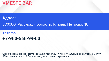 VMESTE BAR по адресу 390000, Рязанская область, Рязань, Петрова, 10 в дальнейшем Организация, размещена в следующих категориях: