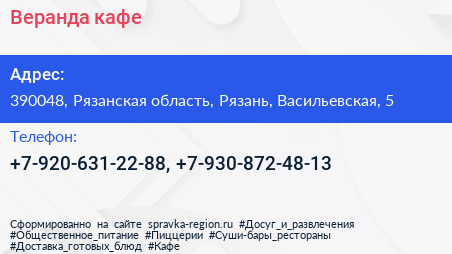 Веранда, кафе по адресу 390048, Рязанская область, Рязань, Васильевская, 5 в дальнейшем Организация, размещена в следующих категориях: