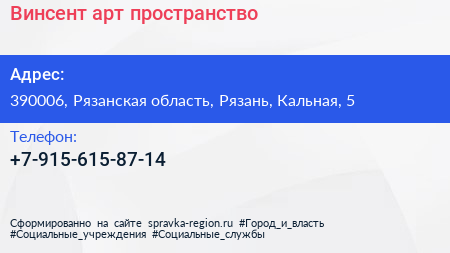 Винсент, арт-пространство по адресу 390006, Рязанская область, Рязань, Кальная, 5 в дальнейшем Организация, размещена в следующих категориях:
