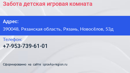 Забота, детская игровая комната по адресу 390048, Рязанская область, Рязань, Новосёлов, 53д в дальнейшем Организация, размещена в следующих категориях: