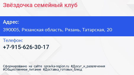 Звёздочка, семейный клуб по адресу 390005, Рязанская область, Рязань, Татарская, 20 в дальнейшем Организация, размещена в следующих категориях: