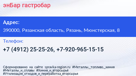 энБар, гастробар по адресу 390000, Рязанская область, Рязань, Мюнстерская, 8 в дальнейшем Организация, размещена в следующих категориях: