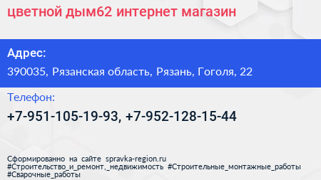цветной дым62, интернет-магазин по адресу 390035, Рязанская область, Рязань, Гоголя, 22 в дальнейшем Организация, размещена в следующих категориях: