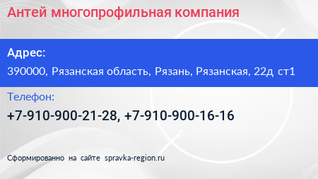 Антей, многопрофильная компания по адресу 390000, Рязанская область, Рязань, Рязанская, 22д ст1 в дальнейшем Организация, размещена в следующих категориях: