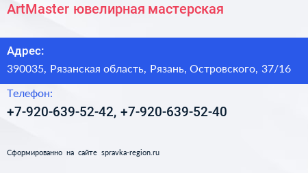 ArtMaster, ювелирная мастерская по адресу 390035, Рязанская область, Рязань, Островского, 37/16 в дальнейшем Организация, размещена в следующих категориях: