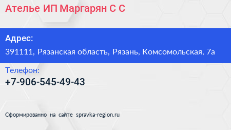 Ателье, ИП Маргарян С.С. по адресу 391111, Рязанская область, Рязань, Комсомольская, 7а в дальнейшем Организация, размещена в следующих категориях: