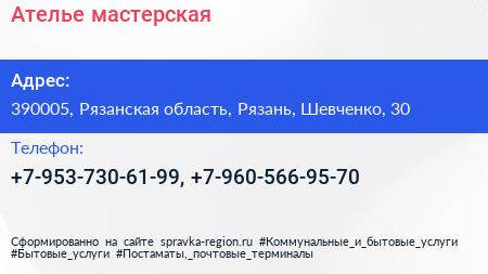 Ателье-мастерская по адресу 390005, Рязанская область, Рязань, Шевченко, 30 в дальнейшем Организация, размещена в следующих категориях: