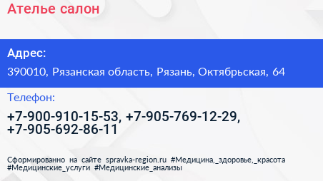 Ателье-салон по адресу 390010, Рязанская область, Рязань, Октябрьская, 64 в дальнейшем Организация, размещена в следующих категориях: