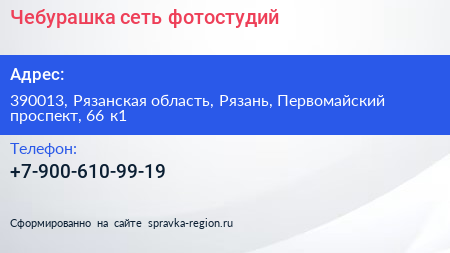 Чебурашка, сеть фотостудий по адресу 390013, Рязанская область, Рязань, Первомайский проспект, 66 к1 в дальнейшем Организация, размещена в следующих категориях: