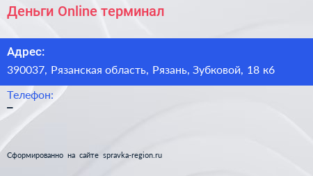 Деньги Online, терминал по адресу 390037, Рязанская область, Рязань, Зубковой, 18 к6 в дальнейшем Организация, размещена в следующих категориях: