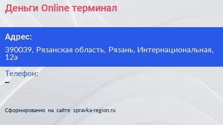 Деньги Online, терминал по адресу 390039, Рязанская область, Рязань, Интернациональная, 12а в дальнейшем Организация, размещена в следующих категориях:
