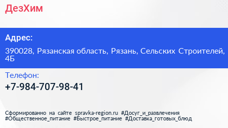 ДезХим по адресу 390028, Рязанская область, Рязань, Сельских Строителей, 4Б в дальнейшем Организация, размещена в следующих категориях: