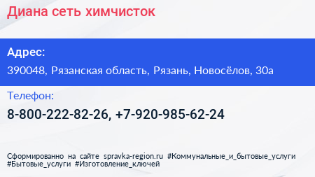 Диана, сеть химчисток по адресу 390048, Рязанская область, Рязань, Новосёлов, 30а в дальнейшем Организация, размещена в следующих категориях: