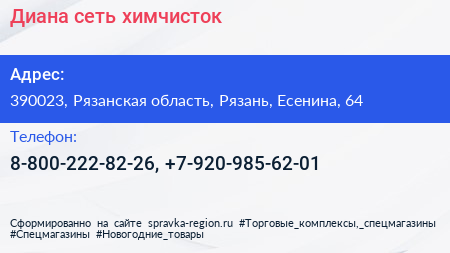 Диана, сеть химчисток по адресу 390023, Рязанская область, Рязань, Есенина, 64 в дальнейшем Организация, размещена в следующих категориях:
