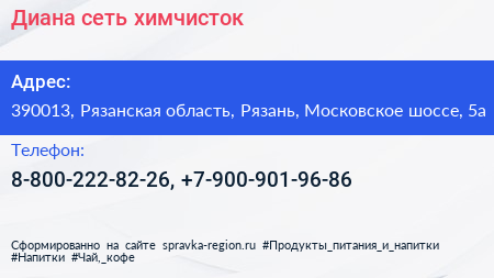 Диана, сеть химчисток по адресу 390013, Рязанская область, Рязань, Московское шоссе, 5а в дальнейшем Организация, размещена в следующих категориях: