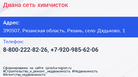 Диана, сеть химчисток по адресу 390507, Рязанская область, Рязань, село Дядьково, 1 в дальнейшем Организация, размещена в следующих категориях: