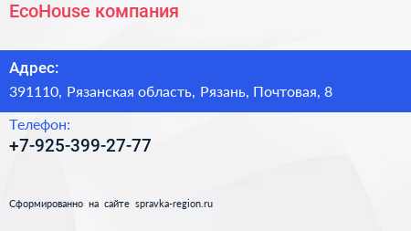 EcoHouse, компания по адресу 391110, Рязанская область, Рязань, Почтовая, 8 в дальнейшем Организация, размещена в следующих категориях: