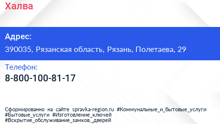 Халва по адресу 390035, Рязанская область, Рязань, Полетаева, 29 в дальнейшем Организация, размещена в следующих категориях: