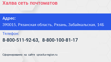 Халва, сеть почтоматов по адресу 390015, Рязанская область, Рязань, Забайкальская, 14Б в дальнейшем Организация, размещена в следующих категориях: