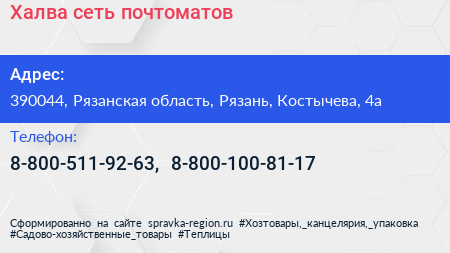 Халва, сеть почтоматов по адресу 390044, Рязанская область, Рязань, Костычева, 4а в дальнейшем Организация, размещена в следующих категориях: