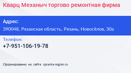 Кварц Механыч, торгово-ремонтная фирма по адресу 390048, Рязанская область, Рязань, Новосёлов, 30а в дальнейшем Организация, размещена в следующих категориях: