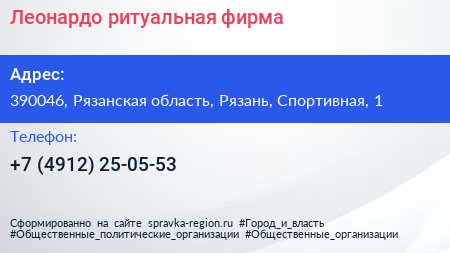 Леонардо, ритуальная фирма по адресу 390046, Рязанская область, Рязань, Спортивная, 1 в дальнейшем Организация, размещена в следующих категориях: