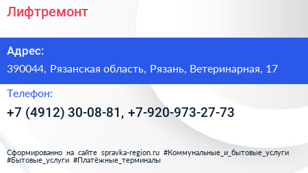 Лифтремонт по адресу 390044, Рязанская область, Рязань, Ветеринарная, 17 в дальнейшем Организация, размещена в следующих категориях: