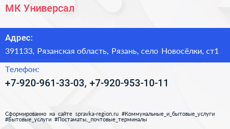 МК-Универсал по адресу 391133, Рязанская область, Рязань, село Новосёлки, ст1 в дальнейшем Организация, размещена в следующих категориях: