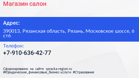 Магазин-салон по адресу 390013, Рязанская область, Рязань, Московское шоссе, 6 ст6 в дальнейшем Организация, размещена в следующих категориях: