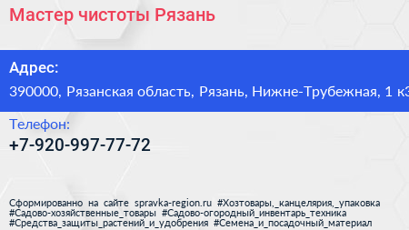 Мастер чистоты Рязань по адресу 390000, Рязанская область, Рязань, Нижне-Трубежная, 1 к3 в дальнейшем Организация, размещена в следующих категориях: