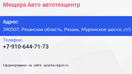 Мещера Авто, автотехцентр по адресу 390507, Рязанская область, Рязань, Муромское шоссе, ст5 в дальнейшем Организация, размещена в следующих категориях: