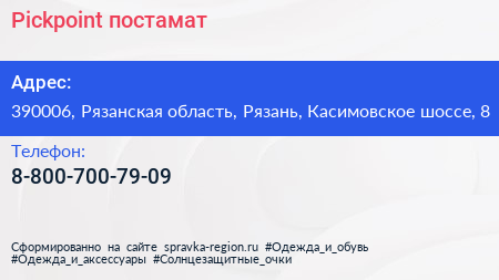 Pickpoint, постамат по адресу 390006, Рязанская область, Рязань, Касимовское шоссе, 8 в дальнейшем Организация, размещена в следующих категориях: