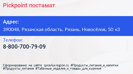 Pickpoint, постамат по адресу 390048, Рязанская область, Рязань, Новосёлов, 50 к3 в дальнейшем Организация, размещена в следующих категориях: