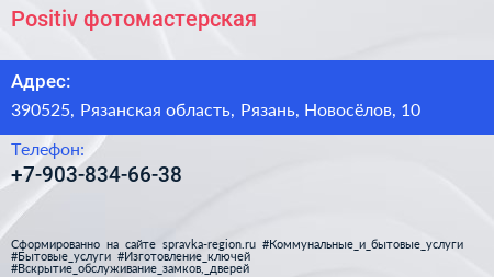 Positiv, фотомастерская по адресу 390525, Рязанская область, Рязань, Новосёлов, 10 в дальнейшем Организация, размещена в следующих категориях: