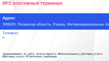 RPS, платежный терминал по адресу 390039, Рязанская область, Рязань, Интернациональная, 4а в дальнейшем Организация, размещена в следующих категориях: