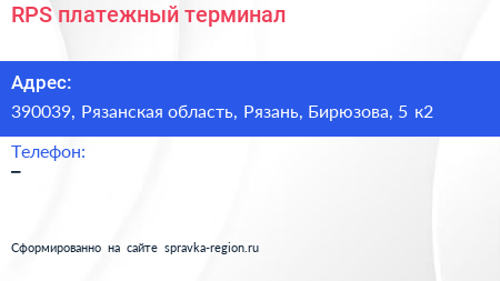 RPS, платежный терминал по адресу 390039, Рязанская область, Рязань, Бирюзова, 5 к2 в дальнейшем Организация, размещена в следующих категориях: