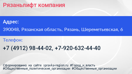 Рязаньлифт, компания по адресу 390048, Рязанская область, Рязань, Шереметьевская, 6 в дальнейшем Организация, размещена в следующих категориях: