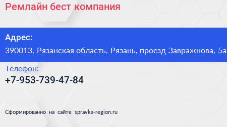 Ремлайн-бест, компания по адресу 390013, Рязанская область, Рязань, проезд Завражнова, 5а в дальнейшем Организация, размещена в следующих категориях: