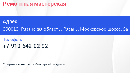 Ремонтная мастерская по адресу 390013, Рязанская область, Рязань, Московское шоссе, 5а в дальнейшем Организация, размещена в следующих категориях: