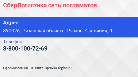 СберЛогистика, сеть постаматов по адресу 390026, Рязанская область, Рязань, 4-я линия, 1 в дальнейшем Организация, размещена в следующих категориях: