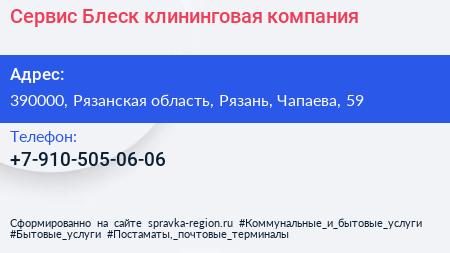 Сервис Блеск, клининговая компания по адресу 390000, Рязанская область, Рязань, Чапаева, 59 в дальнейшем Организация, размещена в следующих категориях: