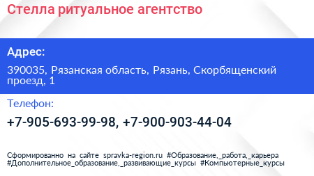 Стелла, ритуальное агентство по адресу 390035, Рязанская область, Рязань, Скорбященский проезд, 1 в дальнейшем Организация, размещена в следующих категориях: