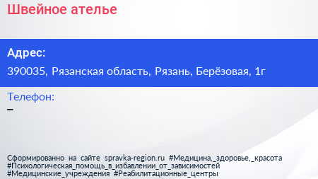 Швейное ателье по адресу 390035, Рязанская область, Рязань, Берёзовая, 1г в дальнейшем Организация, размещена в следующих категориях: